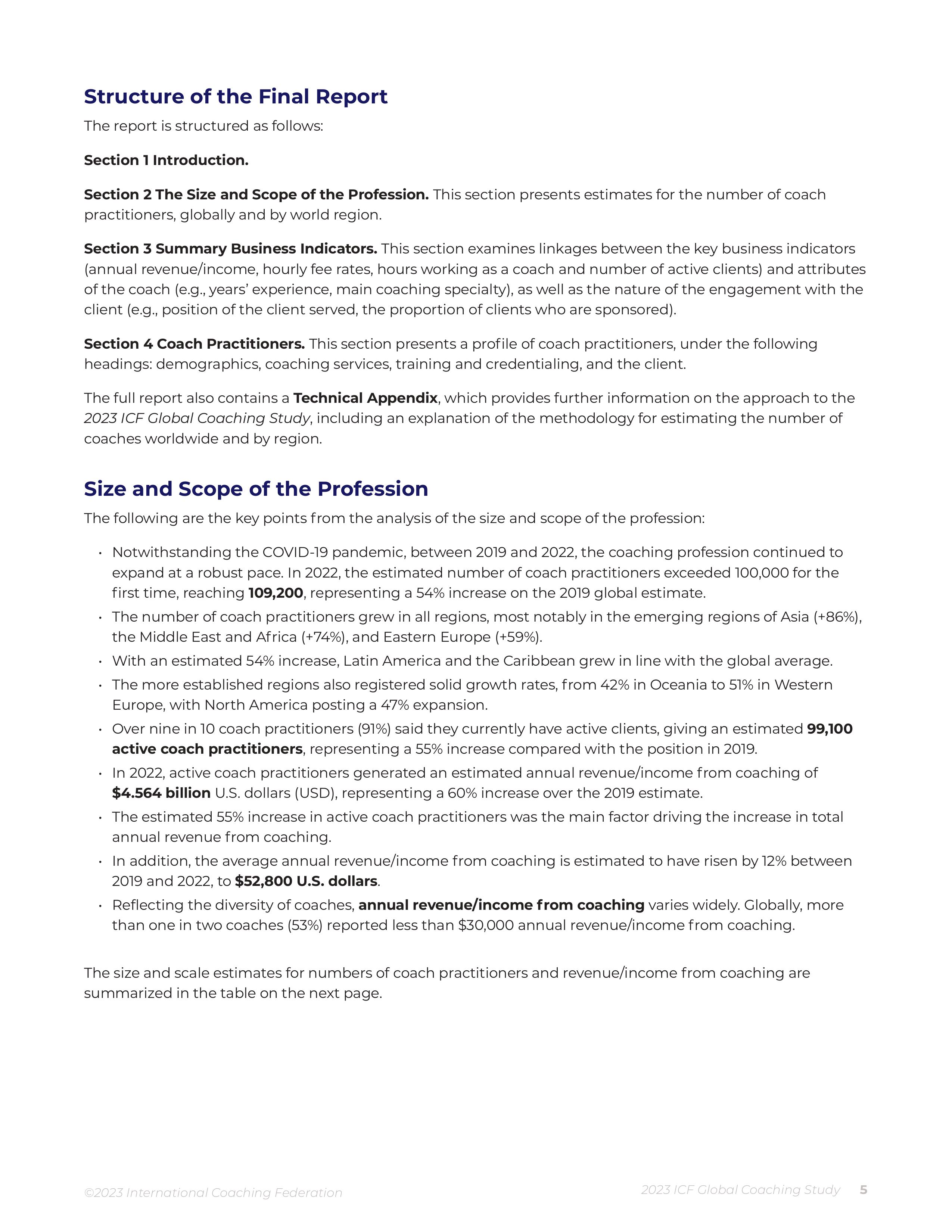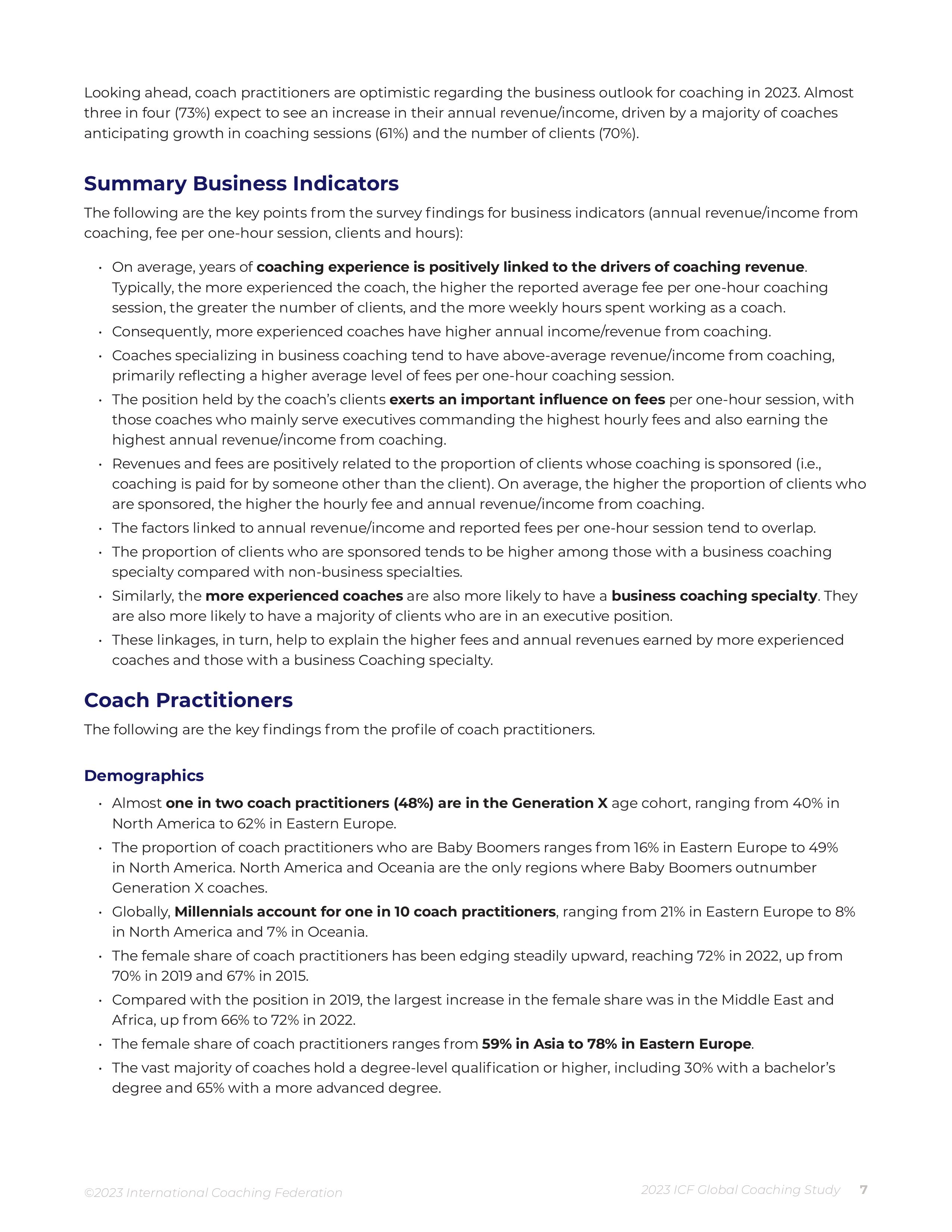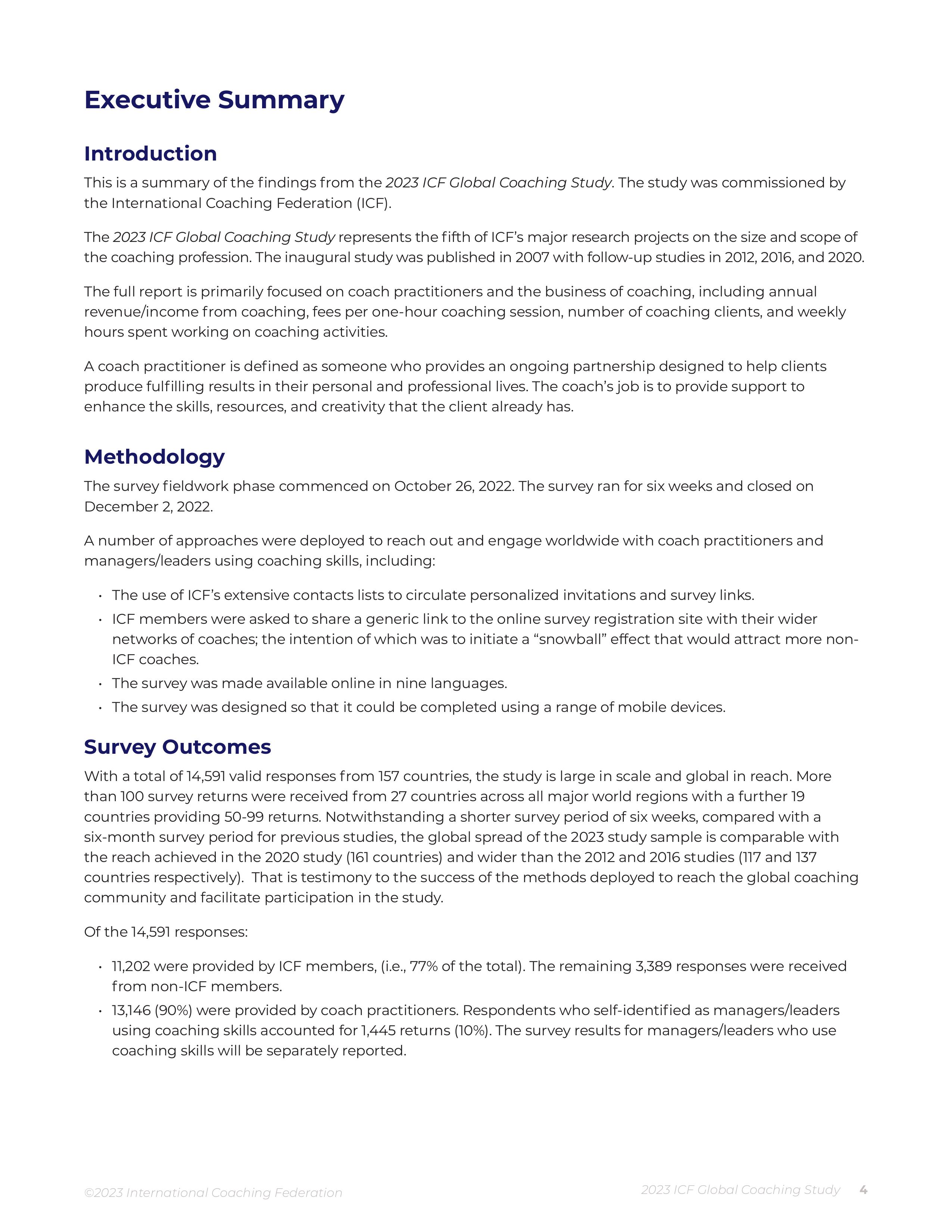 This is a summary of the findings from the 2023 ICF Global Coaching Study. The study was commissioned by the International Coaching Federation (ICF). The 2023 ICF Global Coaching Study represents the fifth of ICF’s major research projects on the size and scope of the coaching profession. The inaugural study was published in 2007 with follow-up studies in 2012, 2016, and 2020. The full report is primarily focused on coach practitioners and the business of coaching, including annual revenue/income from coaching, fees per one-hour coaching session, number of coaching clients, and weekly hours spent working on coaching activities. A coach practitioner is defined as someone who provides an ongoing partnership designed to help clients produce fulfilling results in their personal and professional lives. The coach’s job is to provide support to enhance the skills, resources, and creativity that the client already has.