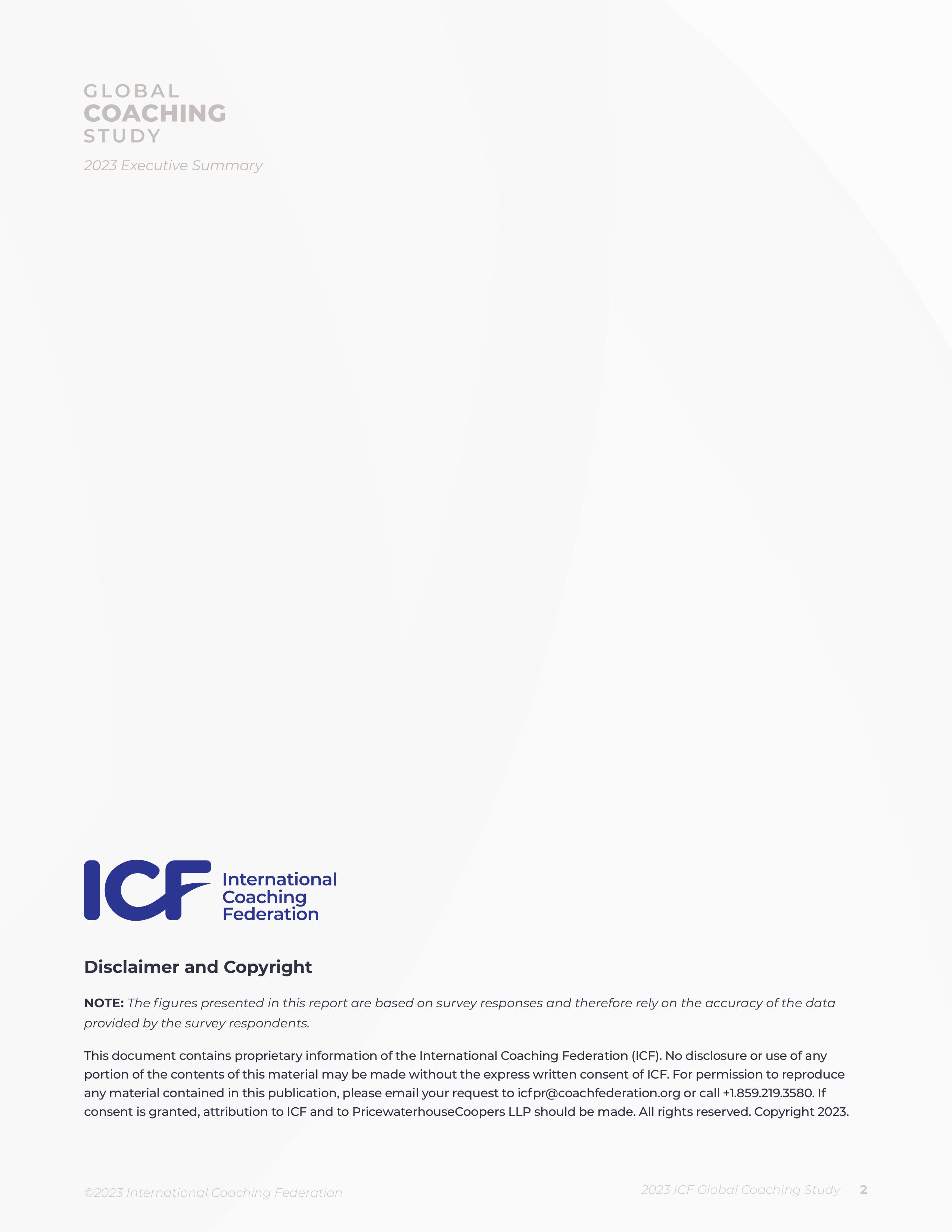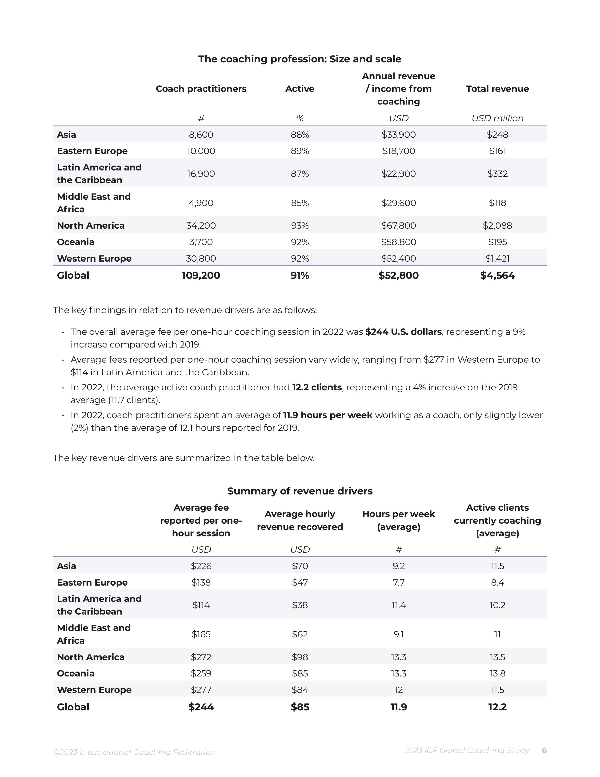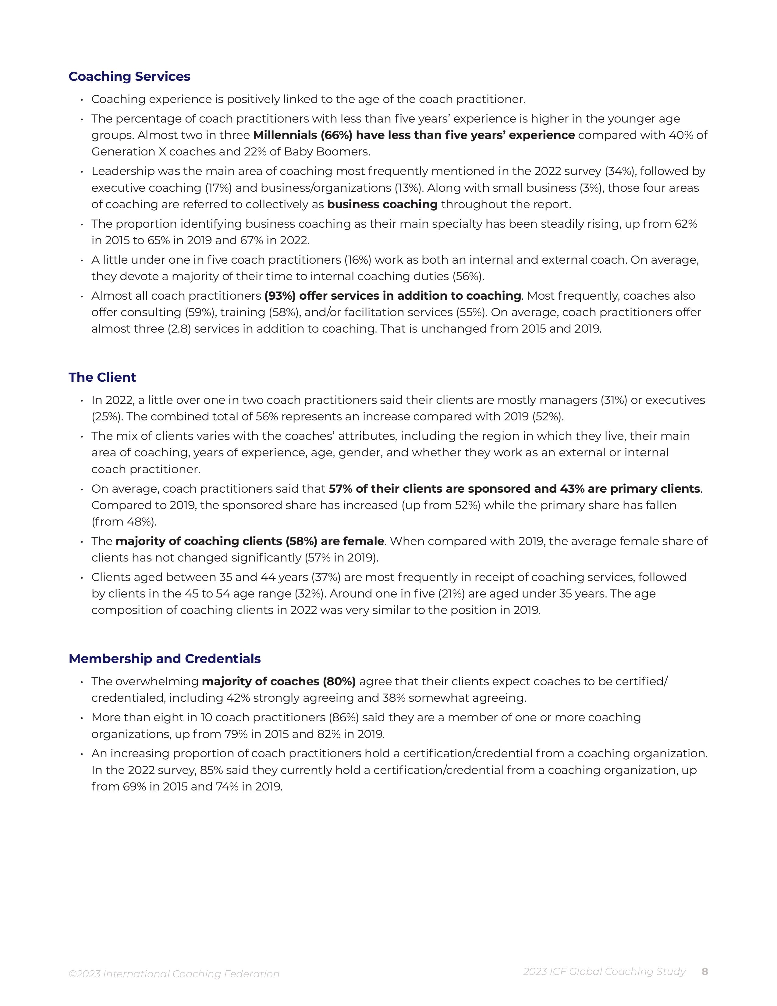 This is a summary of the findings from the 2023 ICF Global Coaching Study. The study was commissioned by the International Coaching Federation (ICF). The 2023 ICF Global Coaching Study represents the fifth of ICF’s major research projects on the size and scope of the coaching profession. The inaugural study was published in 2007 with follow-up studies in 2012, 2016, and 2020. The full report is primarily focused on coach practitioners and the business of coaching, including annual revenue/income from coaching, fees per one-hour coaching session, number of coaching clients, and weekly hours spent working on coaching activities. A coach practitioner is defined as someone who provides an ongoing partnership designed to help clients produce fulfilling results in their personal and professional lives. The coach’s job is to provide support to enhance the skills, resources, and creativity that the client already has.